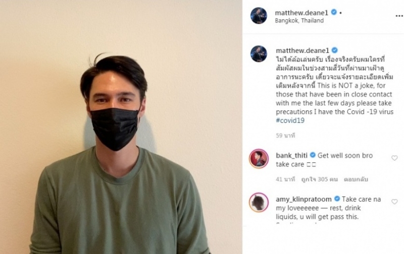 หลังจากที่นักแสดง-พิธีกรชื่อดัง แมทธิว ดีน ออกมาประกาศผ่านโซเชียลของตัวเองว่า ติดcovid ซึ่งถือเป็นดาราไทยรายแรกที่ออกมาประกาศว่าติดดังกล่าว ซึ่งทันทีที่ข่าวออกไป เพื่อนพ้องน้องพี่ร่วมถึงเพื่อนๆ ในวงการบันเทิงต่างเข้ามาให้กำลังใจอย่างมากมาย